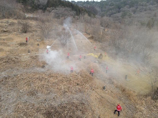 이번 훈련은 묘지 능선에서 산불이 발생한 상황을 가정해 연막탄을 활용한 화재 발생 연출 후, 산불진화인력이 신속히 출동해 호스를 연결하고 초동 진화 작업을 수행하는 방식으로 진행됐다.