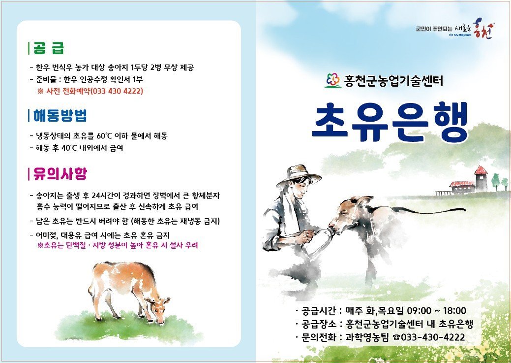 홍천군은 이러한 초유의 특성을 바탕으로 인공수정 확인서를 지참한 관내 농가에 1회 700mL 2병을 무상으로 지원해, 송아지 출생 직후 필요한 초유가 제때 급여되도록 적기 공급에 중점을 두고 있다.