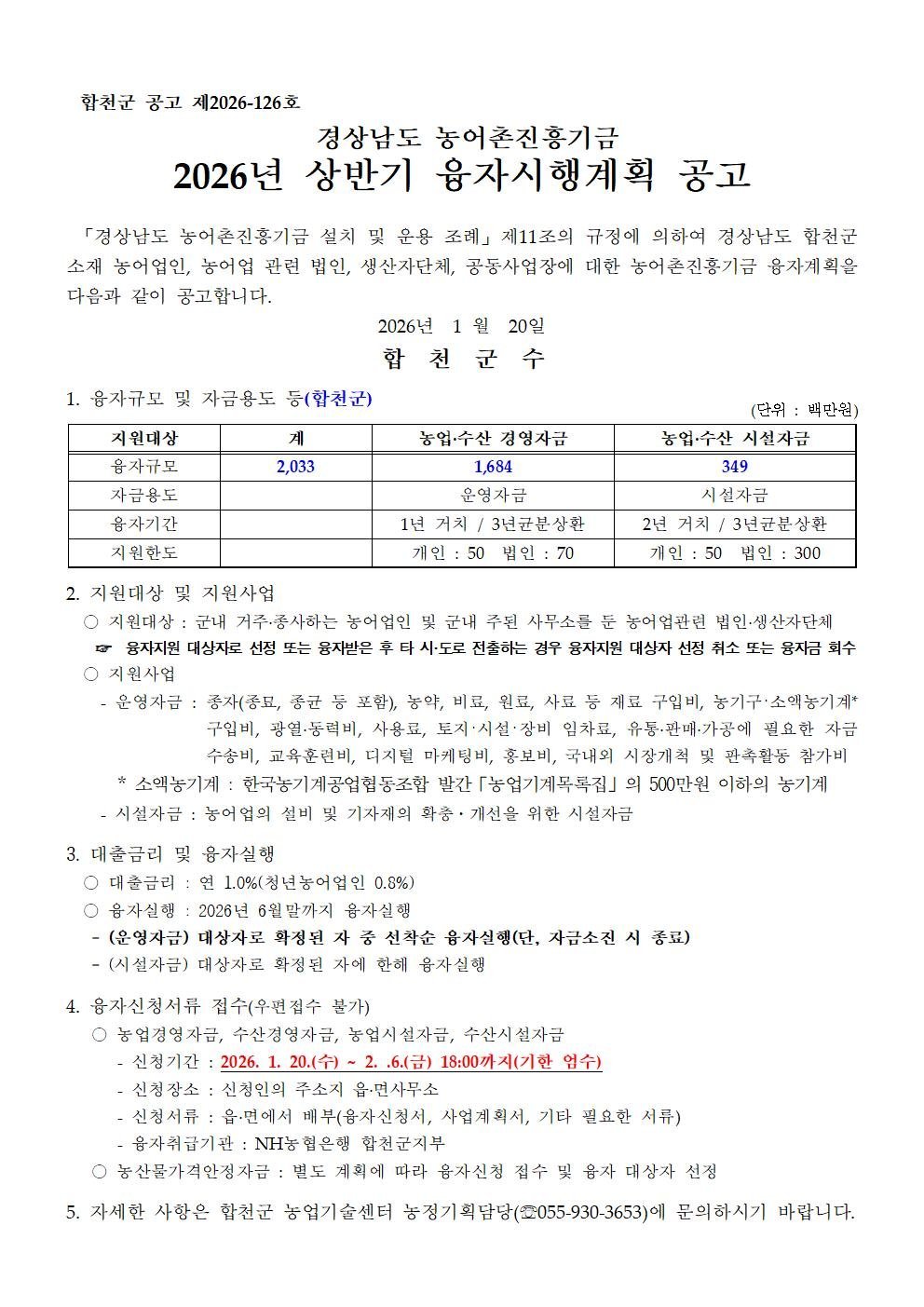 [아시아월드뉴스] 합천군은 1월 20일부터 2월 6일까지 경상남도 농어촌진흥기금 융자 신청을 읍·면사무소에서 접수한다.