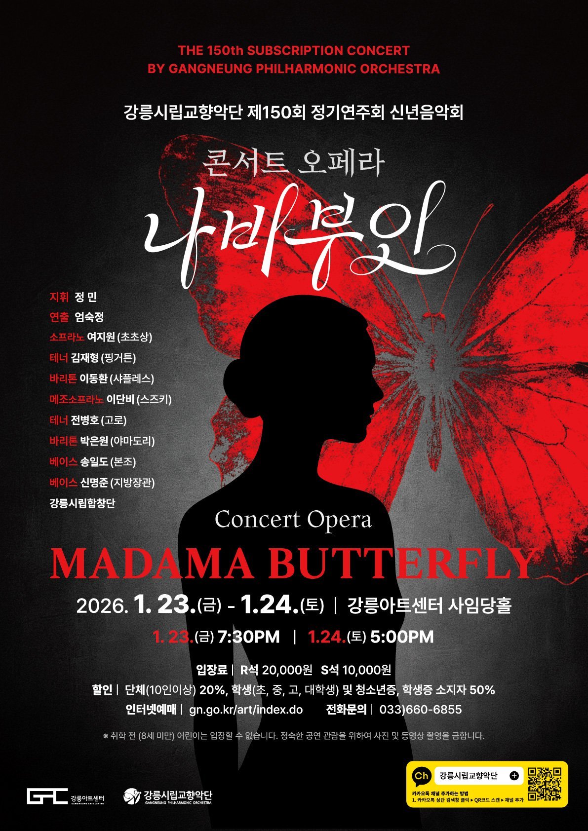 [아시아월드뉴스] 강릉시립교향악단은 2026년의 첫 정기연주회로 오는 23일 19시 30분, 24일 오후 5시 강릉아트센터 사임당홀에서 콘서트 오페라 ‘나비부인’을 선보인다.