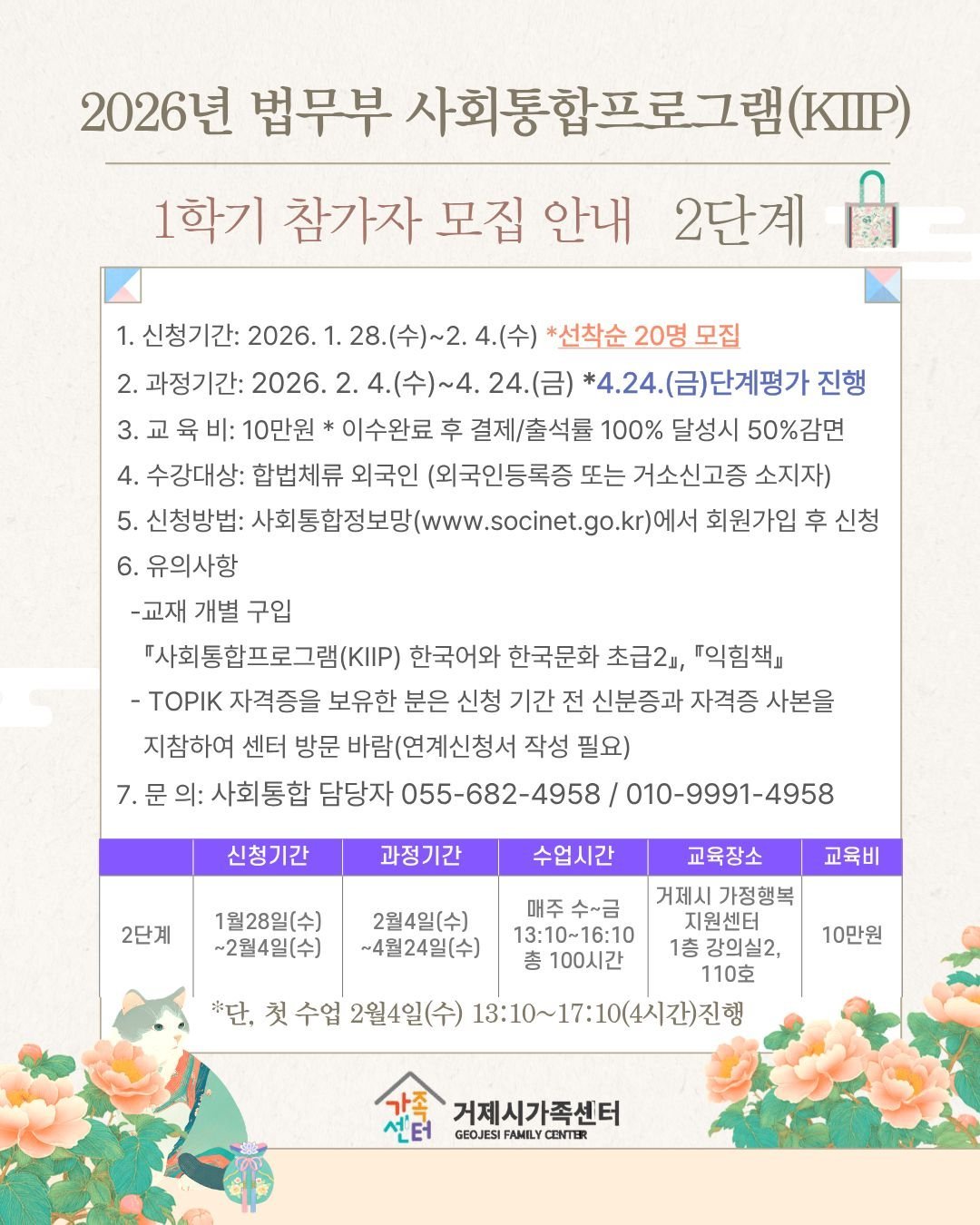 [아시아월드뉴스] 거제시가족센터는 이민자의 안정적인 지역사회 정착과 자립을 지원하기 위해 2026년도 법무부 사회통합프로그램 1학기 참여자를 모집한다고 밝혔다.