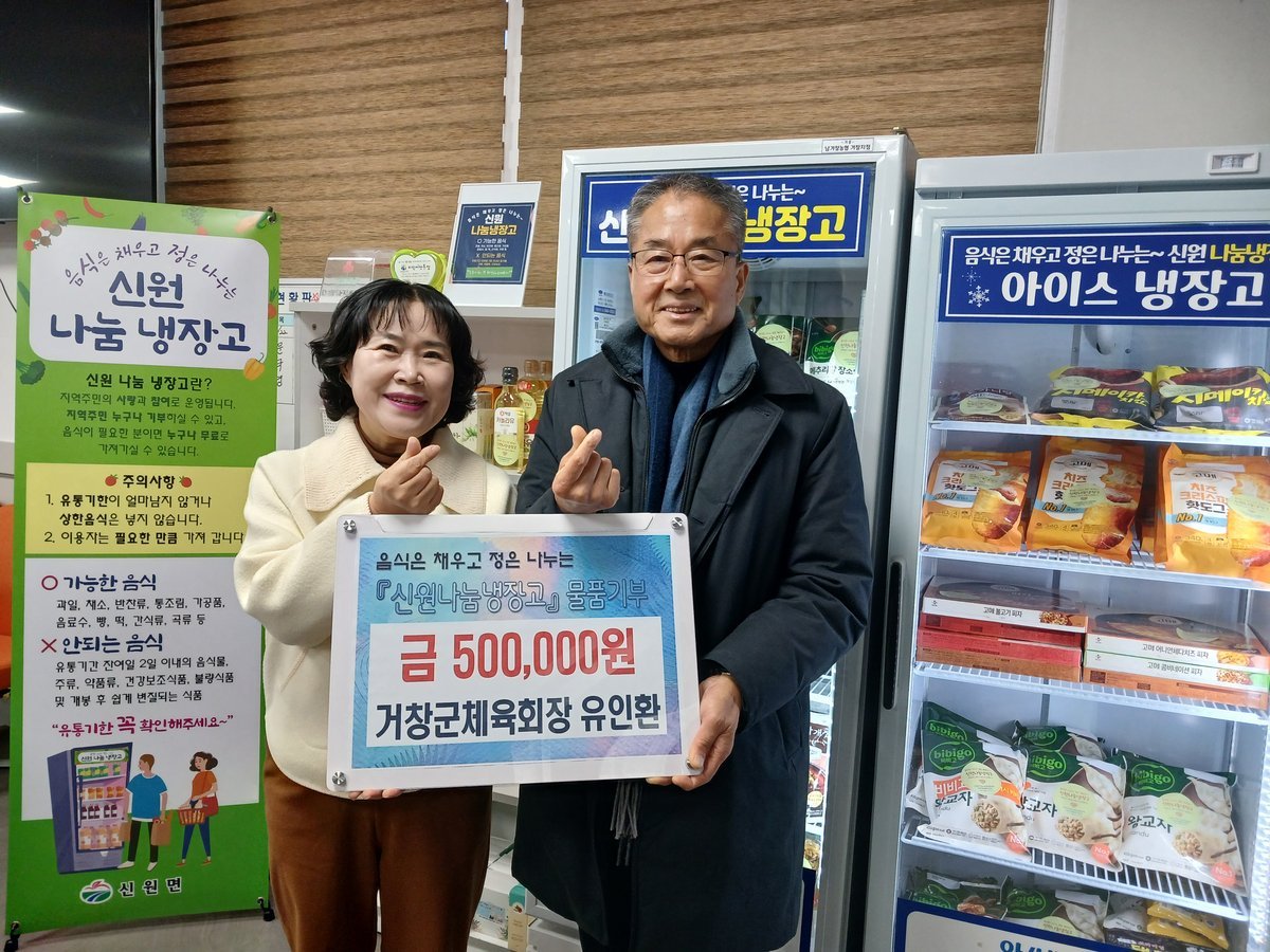 [아시아월드뉴스] 거창군 신원면에서는 지난 22일 유인환 거창군체육회장이 신원 공유냉장고에 50만원 후원금을 전달해 큰 희망과 감동을 전했다고 밝혔다.