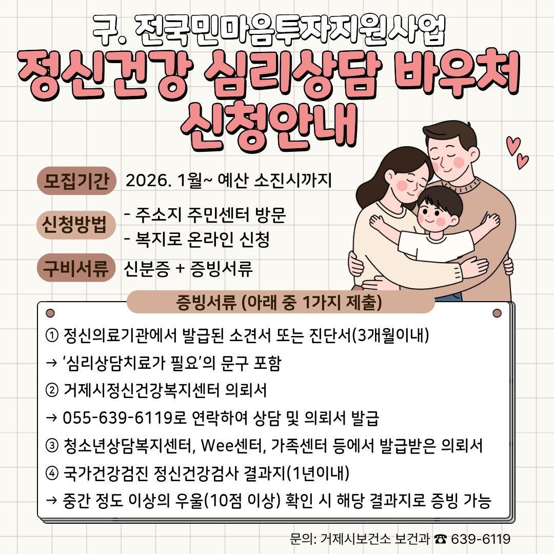 [아시아월드뉴스] 거제시는 2024년부터 시행해 온 '전국민 마음투자 지원사업'을 2026년부터 '정신건강 심리상담 바우처 사업'으로 명칭을 변경해 지속 추진한다.