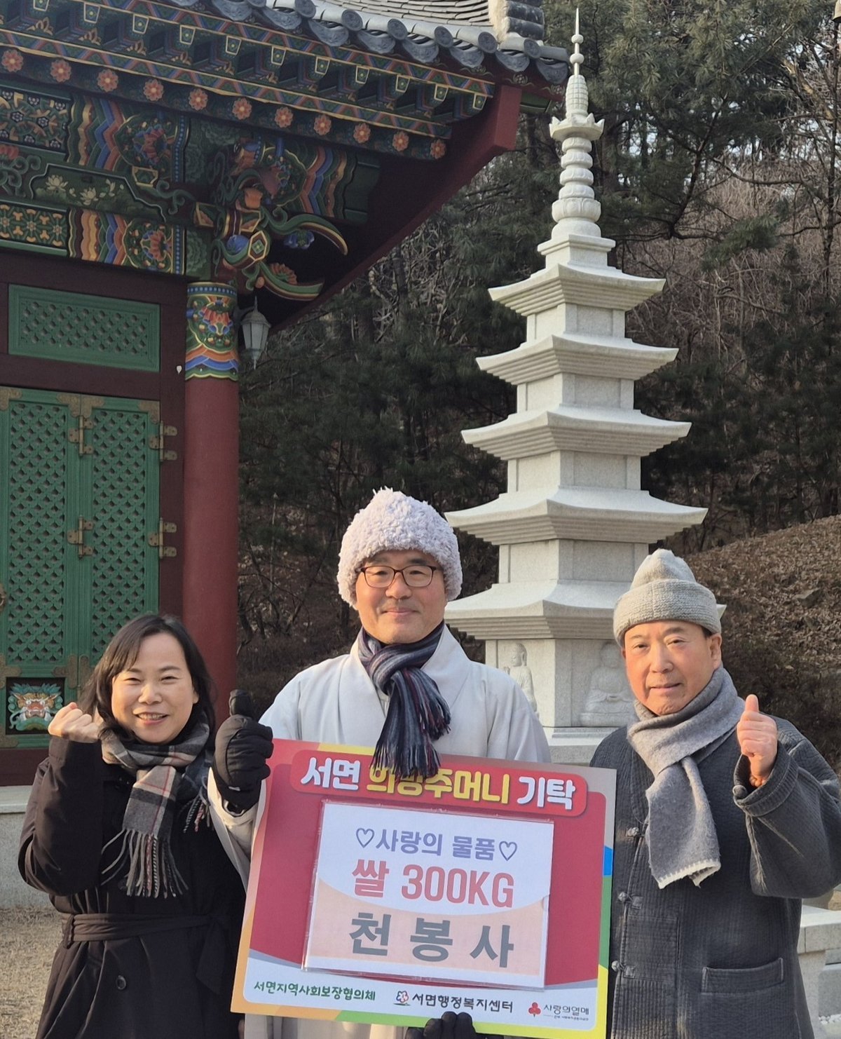 홍천군 서면 대곡2리 오봉산에 있는 천봉사는 아름다운 서면의 자연환경을 품고 있는 사찰로 작년에 이어 올해도 지역 내 어려운 이웃을 위해 따뜻한 나눔을 실천하고 있다.