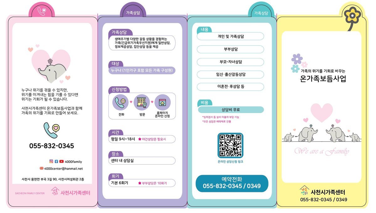 센터는 "가족의 위기는 약함이 아니라, 도움이 필요한 순간일 뿐"이라며 "사천시가족센터가 언제나 가족의 곁에서 함께 하겠다"고 전했다.