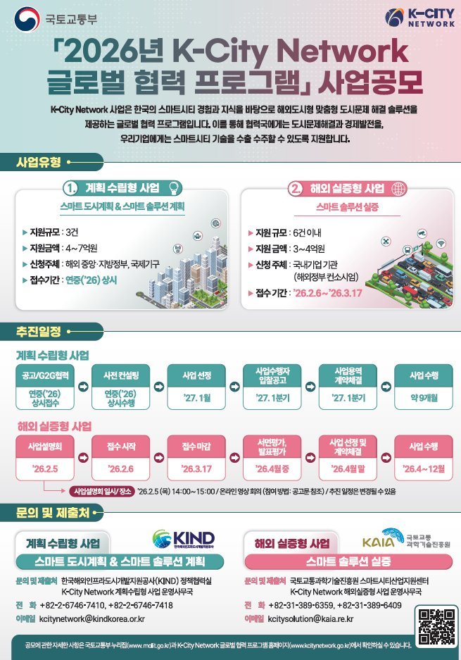[아시아월드뉴스] 정부가 국내 스마트도시 기술의 해외 진출을 지원하기 위해 올해「K-City 네트워크 글로벌 협력 사업*」 공모를 추진한다. 이번 사업을 통해 기업들은 해외 도시에서 자사 기술을 직접 실증하고, 현지 여건에 맞는 사업 모델을 검증해 실제 수주와 사업화로 이어질 수 있는 기회를 얻게 된다.