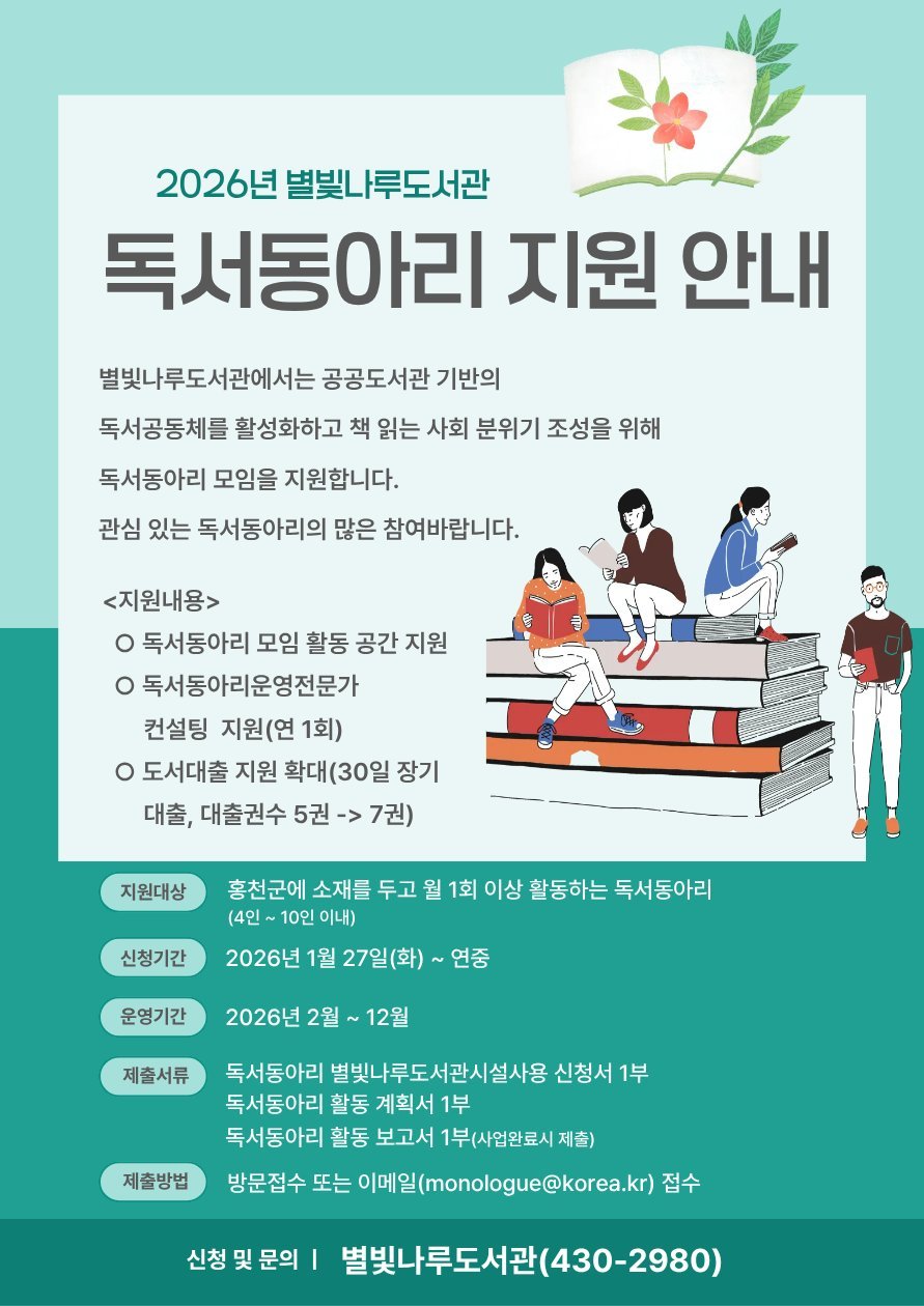 [아시아월드뉴스] 별빛나루 도서관은 홍천군에 소재를 두고 월 1회 이상 활동하는 독서동아리를 대상으로 2026년도 독서동아리 지원사업을 운영한다.