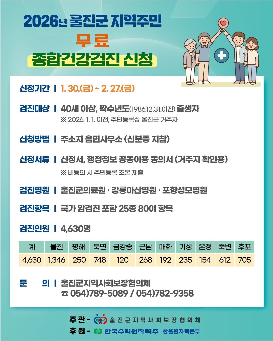 이번 건강검진은 울진군 인구의 약 10%에 해당하는 4630명을 대상으로 하며 신청 기간은 1월 30일부터 2월 27일까지다.