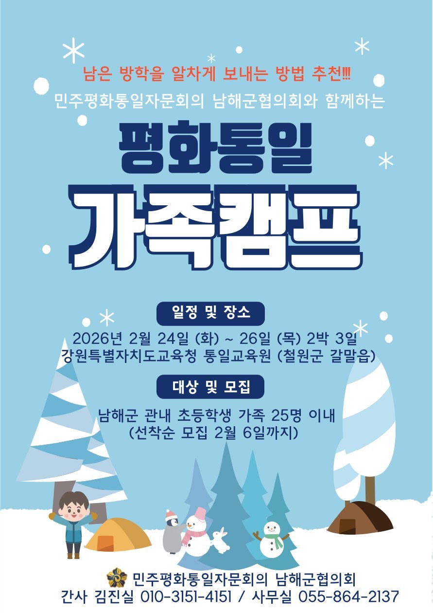 [아시아월드뉴스] 민주평화통일자문회의 경남남해군협의회는 관내 초등학생과 그 가족을 대상으로 ‘2026 평화통일 가족캠프’참가자를 모집한다고 밝혔다.