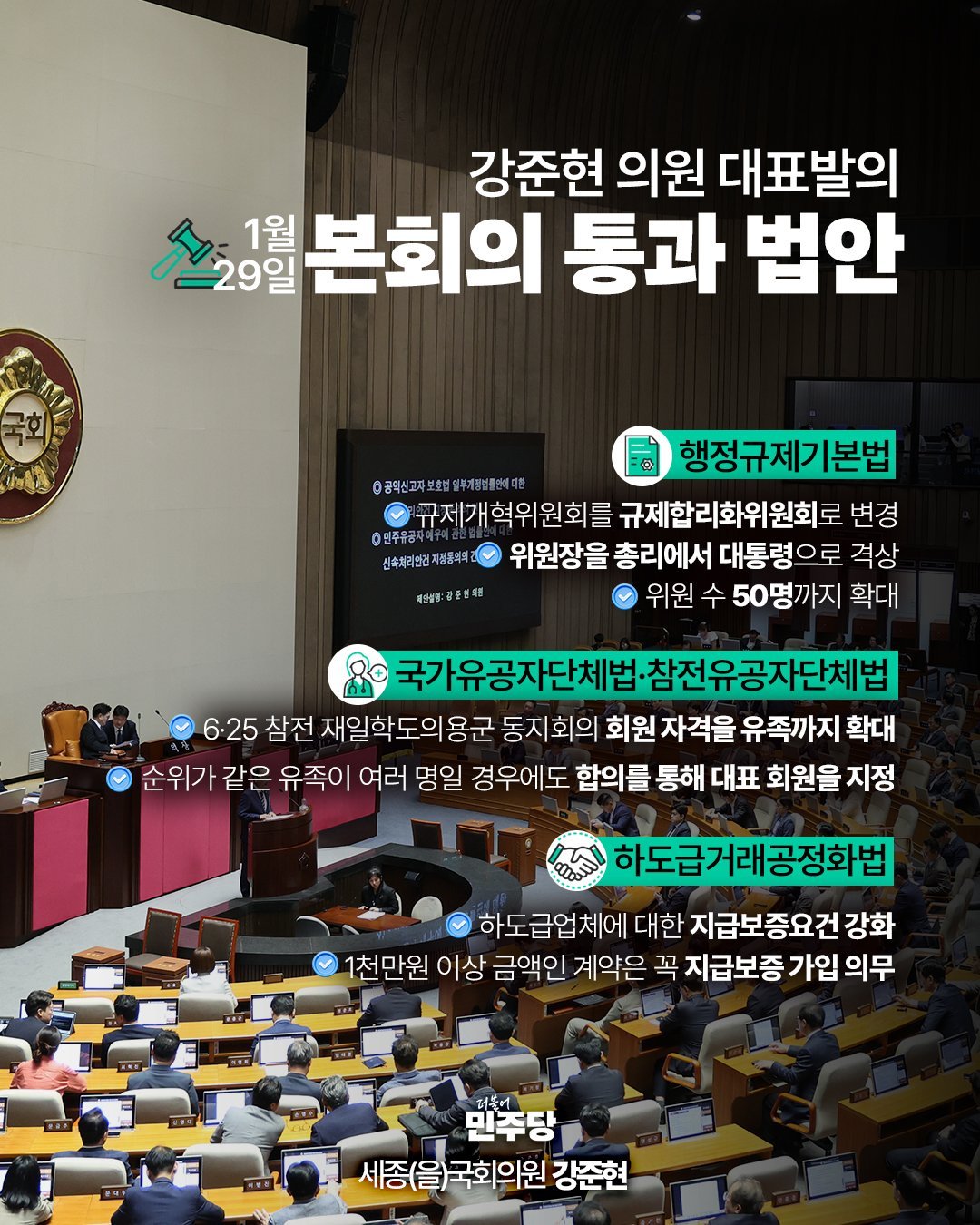 [아시아월드뉴스] 더불어민주당 강준현 국회의원이 대표발의한 4건의 법률안이 29일 국회 본회의를 통과하며 민생경제 보호, 공정한 규제 거버넌스 구축, 국가유공자 예우 강화를 위한 제도 개선에 본격적인 전기를 마련했다.