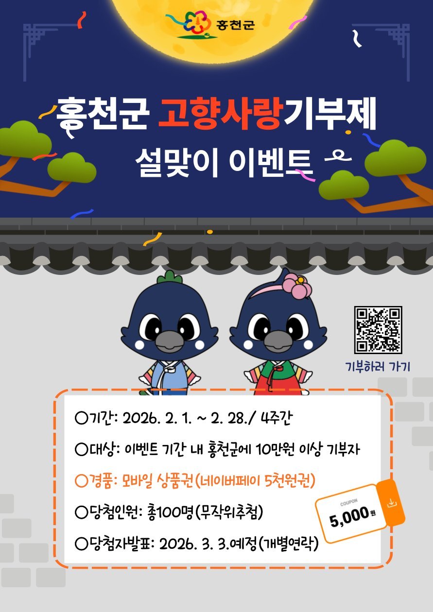 [아시아월드뉴스] 홍천군은 2026년 설 명절을 맞아 고향사랑기부제의 활성화와 건전한 기부 문화 확산을 위해 ‘설맞이 고향사랑기부제 이벤트’를 진행한다.