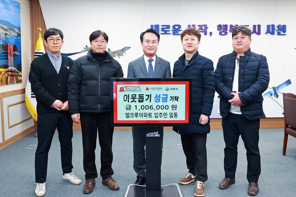 박동식 시장은 "매년 이웃을 향한 따뜻한 마음으로 나눔을 실천하고 있는 사천 엘크루 아파트 입주민 여러분께 깊이 감사드리며 기탁한 성금은 지역 내 어려운 이웃을 위해 소중히 사용하겠다"고 밝혔다.