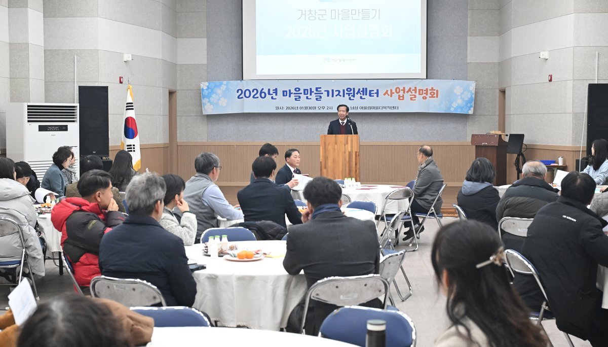[아시아월드뉴스] 거창군 마을만들기지원센터 지난 30일 남상면 어울림다목적회관에서 주민주도형 마을공동체 활성화와 지속가능한 농촌 발전을 도모하기 위해 읍·면 주민과 마을활동가, 완료지구 관계자 등을 대상으로 '2026년 거창군 마을만들기 사업설명회'를 개최했다.