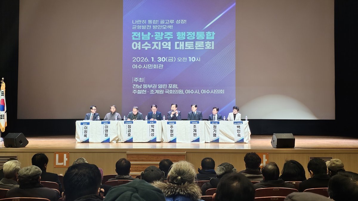 [아시아월드뉴스] 주철현·조계원 국회의원은 여수시, 여수시의회, 전남동부권 열린포럼과 함께 '전남·광주 행정통합 여수지역 대토론회'를 30일 여수시민회관에서 공동 개최하고 전남 동부권의 주요 현안과 행정통합 방향을 놓고 시민 의견을 수렴했다.