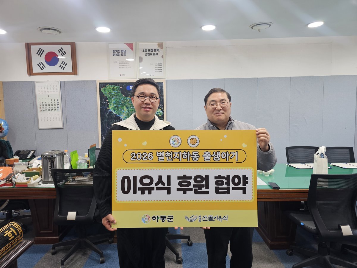 하동군은 2월 2일 군청 부군수실에서 ㈜에코맘의 산골이유식과 ‘2026년 하동군 출생아 이유식 후원 협약’을 체결하고 출산 가정의 경제적 부담을 덜고 건강한 양육환경 조성을 위한 민관 협력의 뜻을 모았다.