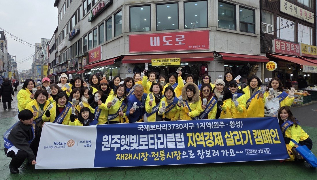 이날 원주햇빛로타리클럽 회원 50여명은 전통시장에서 식료품과 생필품 등을 직접 구매하며 지역 상권 활성화에 힘을 보탰다.