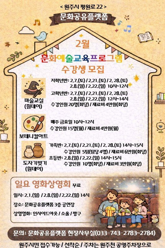 [아시아월드뉴스] 원주시 문화공유플랫폼이 2월 문화예술 교육프로그램 수강생을 모집한다.