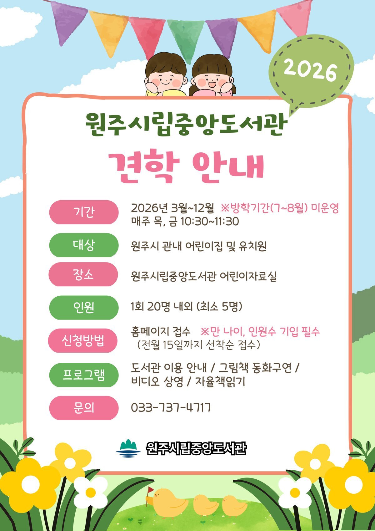 [아시아월드뉴스] 원주시립중앙도서관은 오는 3월부터 12월까지 관내 유치원과 어린이집을 대상으로 도서관 견학 프로그램을 운영한다.