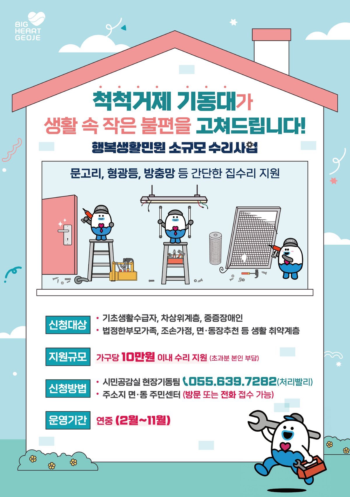 [아시아월드뉴스] 거제시는 일상생활 속 소소하지만 해결이 어려운 불편을 겪고 있는 취약계층을 지원하기 위해 2026년 '척척거제 기동대 행복생활민원 소규모 수리사업'을 추진한다고 밝혔다.