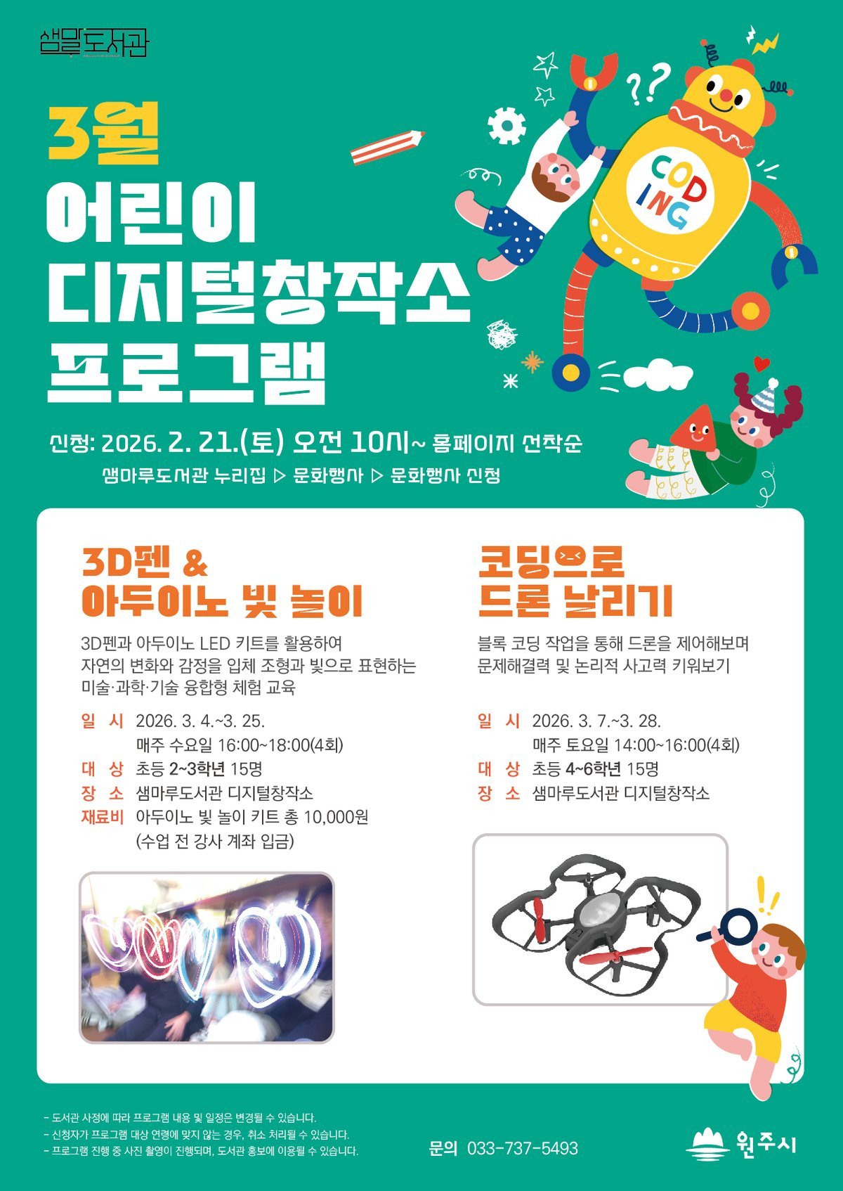 3월에는 △3D펜과 아두이노 조명 키트를 활용해 자연의 변화와 감정을 입체 조형과 빛으로 표현하는 ‘3D펜&아두이노 빛 놀이’△블록 코딩 작업을 통해 드론을 제어하는 ‘코딩으로 드론 날리기’등 2개 강좌가 각각 4회에 걸쳐 진행된다.