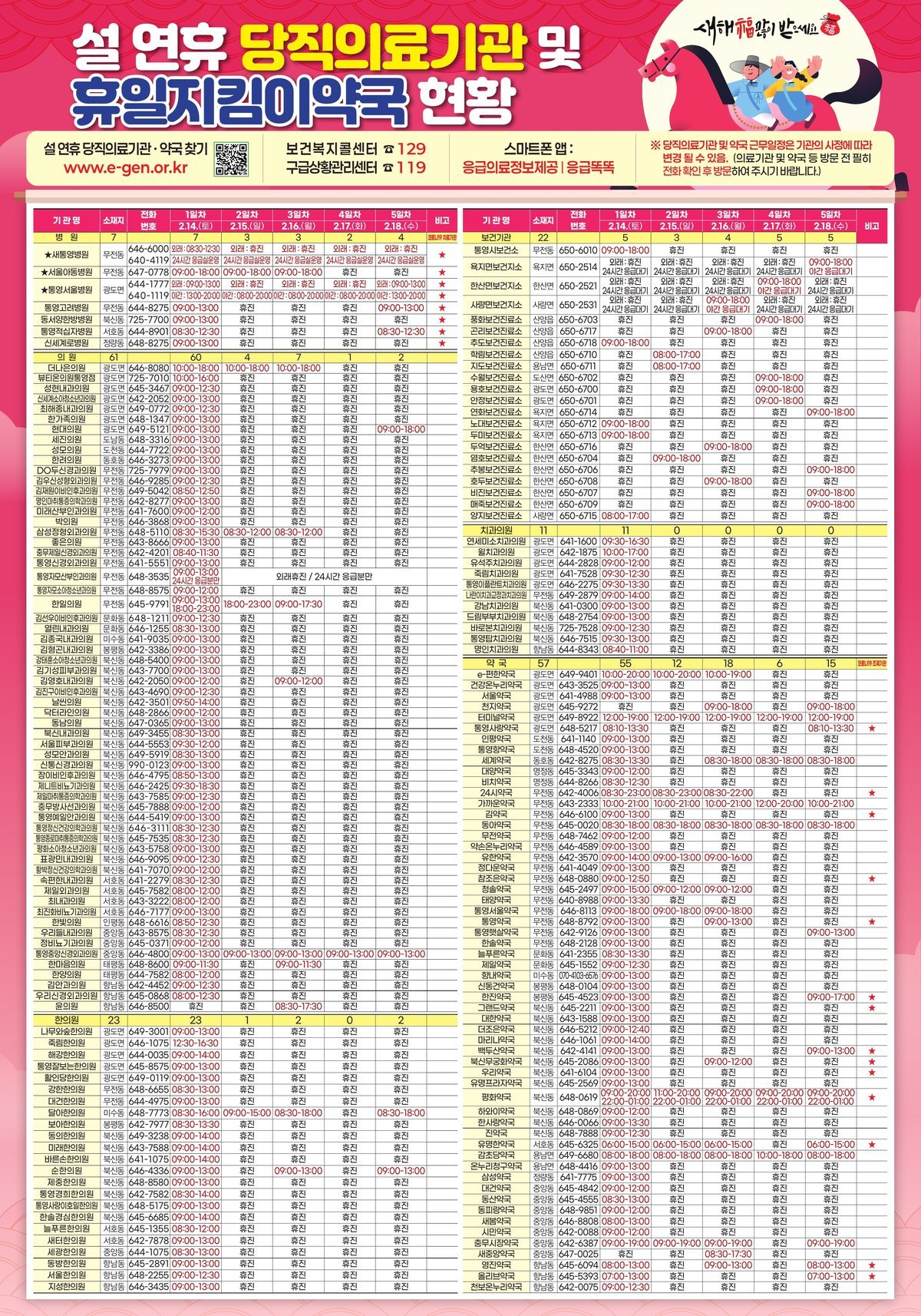 연휴 기간 응급실, 야간진료, 소아청소년 진료 체계를 가동하고 관내 당직의료기관 135개소, 휴일지킴이약국 59개소를 운영해 의료 공백을 최소화할 계획이다.
