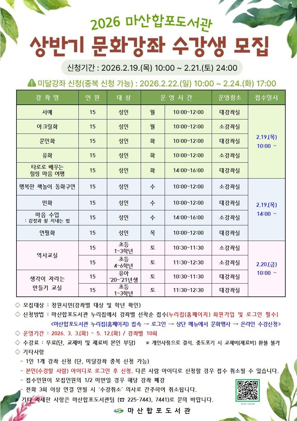 [아시아월드뉴스] 창원특례시 마산합포도서관에서는 시민들에게 다양한 평생학습 기회를 제공하고자 '2026년 상반기 문화강좌'수강생을 2월 19일부터 2월 24일까지 마산합포도서관 누리집에서 온라인으로 모집한다.
