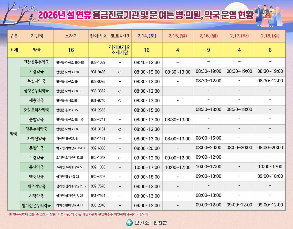 응급환자 발생에 대비해 지역응급의료기관인 삼성합천병원은 설 연휴 동안 24시간 응급실을 운영하며 보건소는 2.16. ~ 2.18. 비상진료를 실시한다.