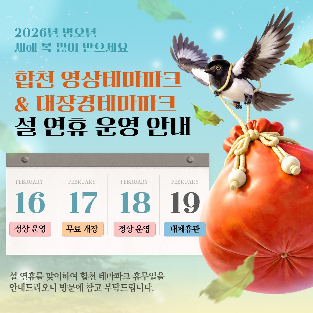 김윤철 군수는 "설 연휴 동안 가족과 함께 소중한 시간을 보내고 다양한 추억을 쌓을 기회로 합천영상테마파크와 대장경테마파크를 추천드리니 많이 찾아주셔서 특별한 하루를 누리시길 바란다"고 전했다.