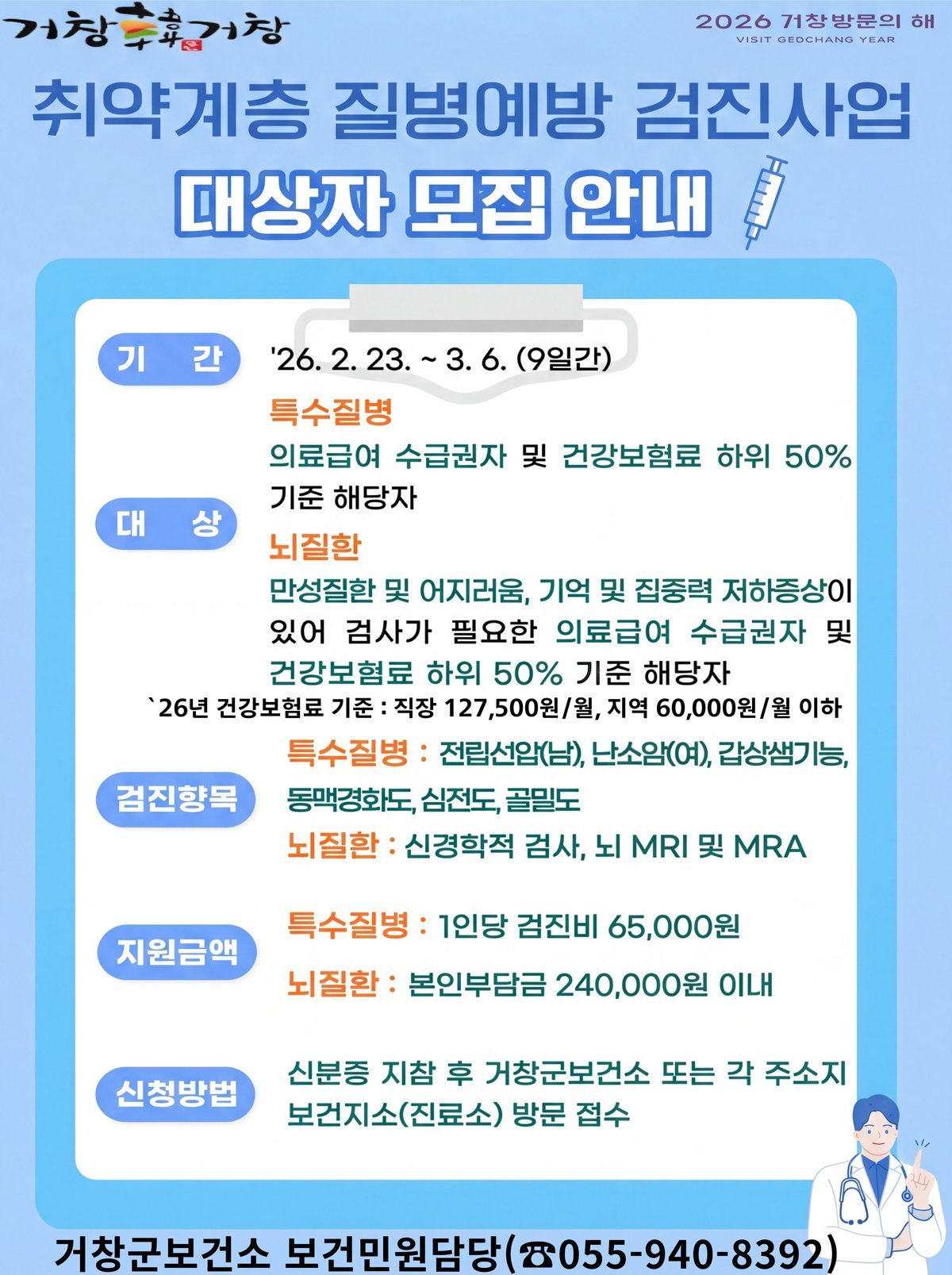 [아시아월드뉴스] 거창군은 의료 취약계층의 질병 조기 발견과 경제적 부담 완화를 위해 '2026년 취약계층 질병 예방 검진사업'대상자를 모집한다.