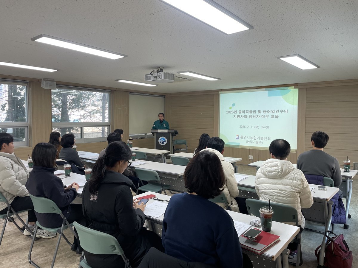 [아시아월드뉴스] 통영시는 지난 11일 농업기술센터 회의실에서 읍면동 업무 담당자를 대상으로‘2026년 기본형 공익직불금 및 농어업인수당 지원사업’직무 교육을 실시했다.