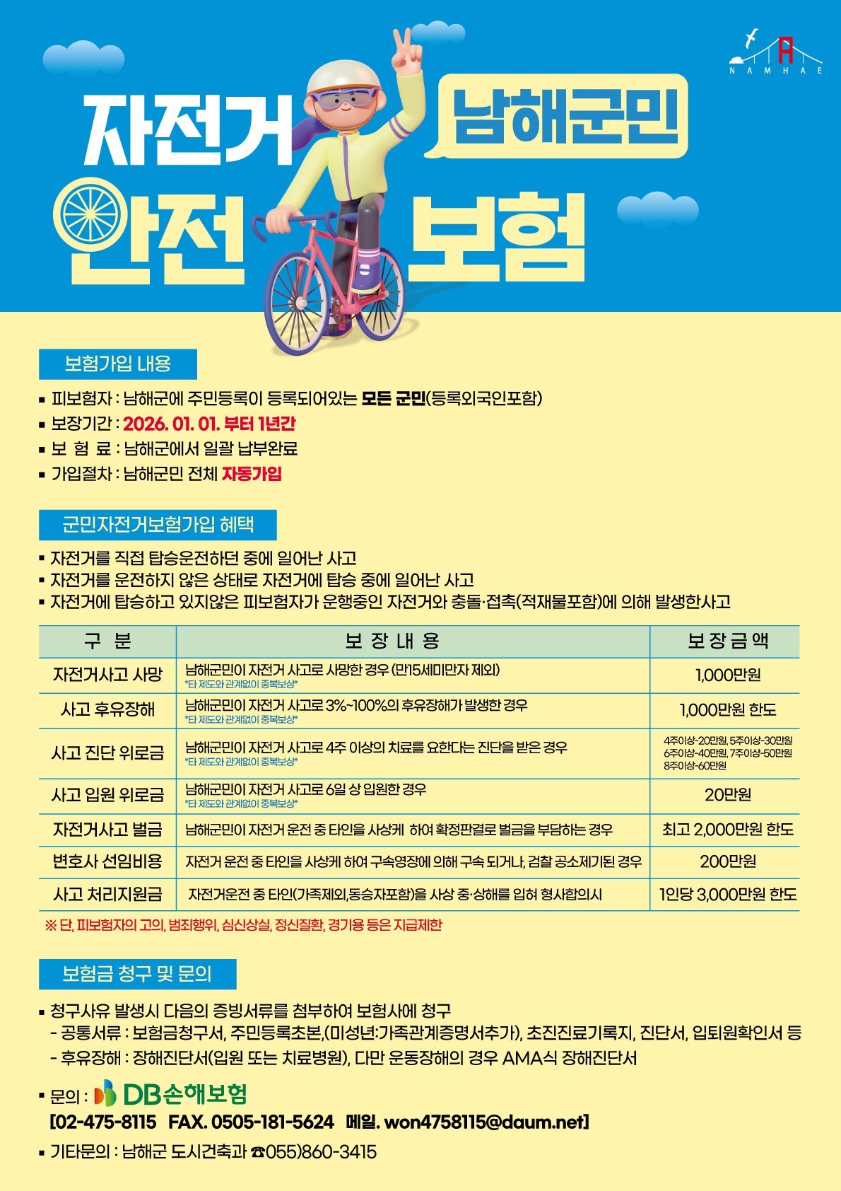 [아시아월드뉴스] 남해군은 2026년에도 ‘남해군민 자전거안전보험’제도를 운영한다.