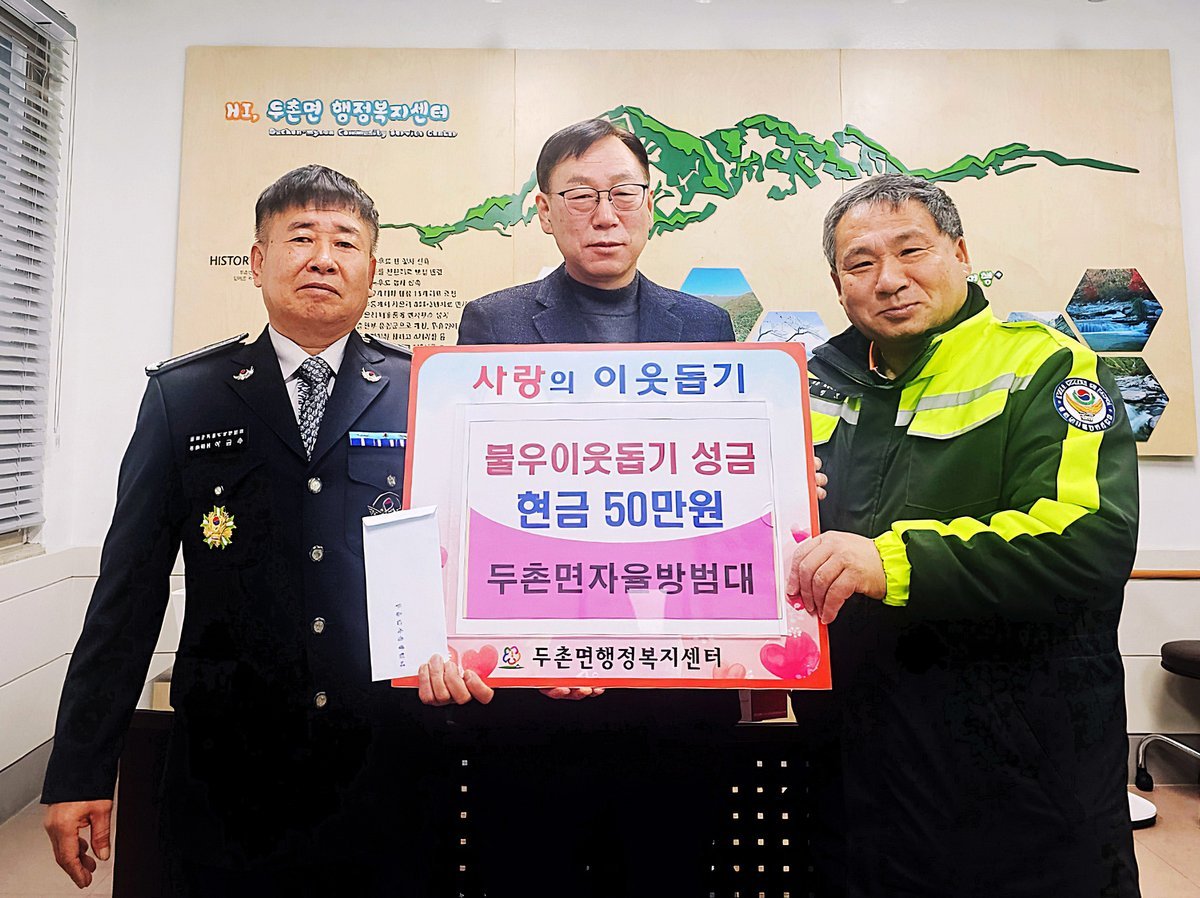 [아시아월드뉴스] 두촌면 자율방범대는 2월 12일 두촌면 행정복지센터를 방문해 어려운 이웃을 위한 성금 50만원을 전달하며 따뜻한 나눔을 실천했다.