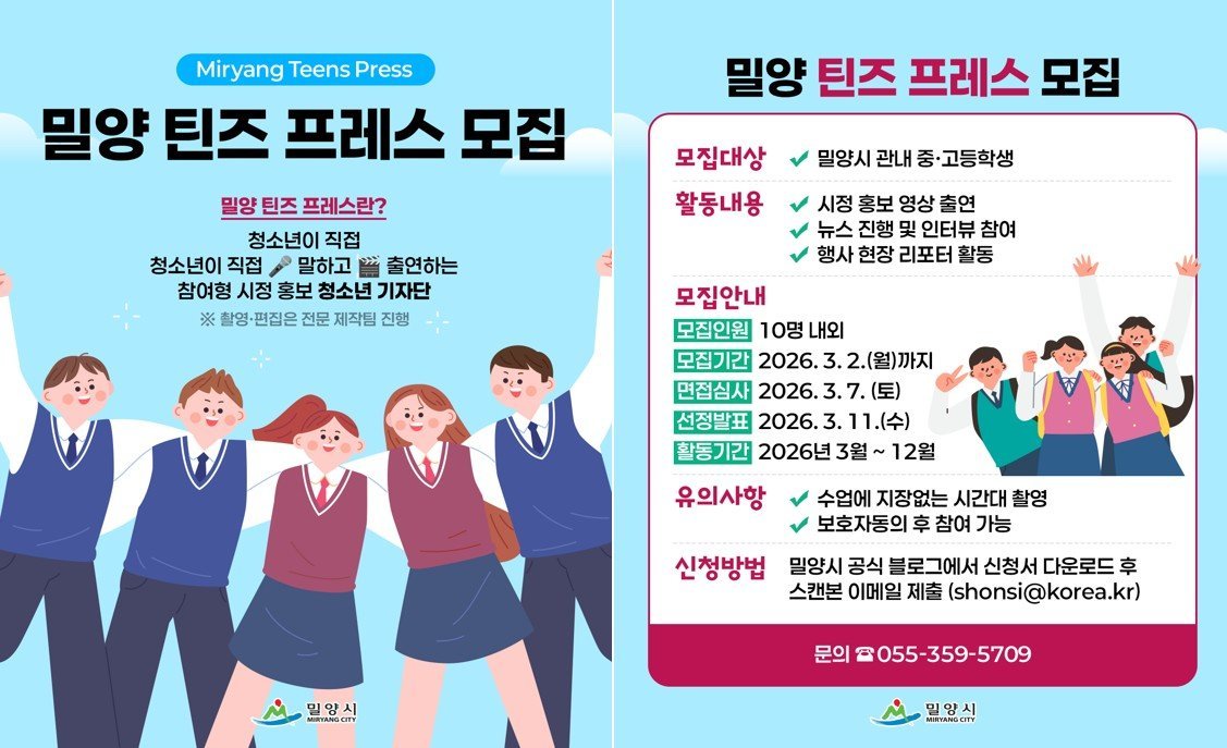 [아시아월드뉴스] 경남 밀양시는 청소년이 직접 시정 소식을 전하는 참여형 홍보 프로그램 '밀양 틴즈 프레스'를 모집한다고 13일 밝혔다.