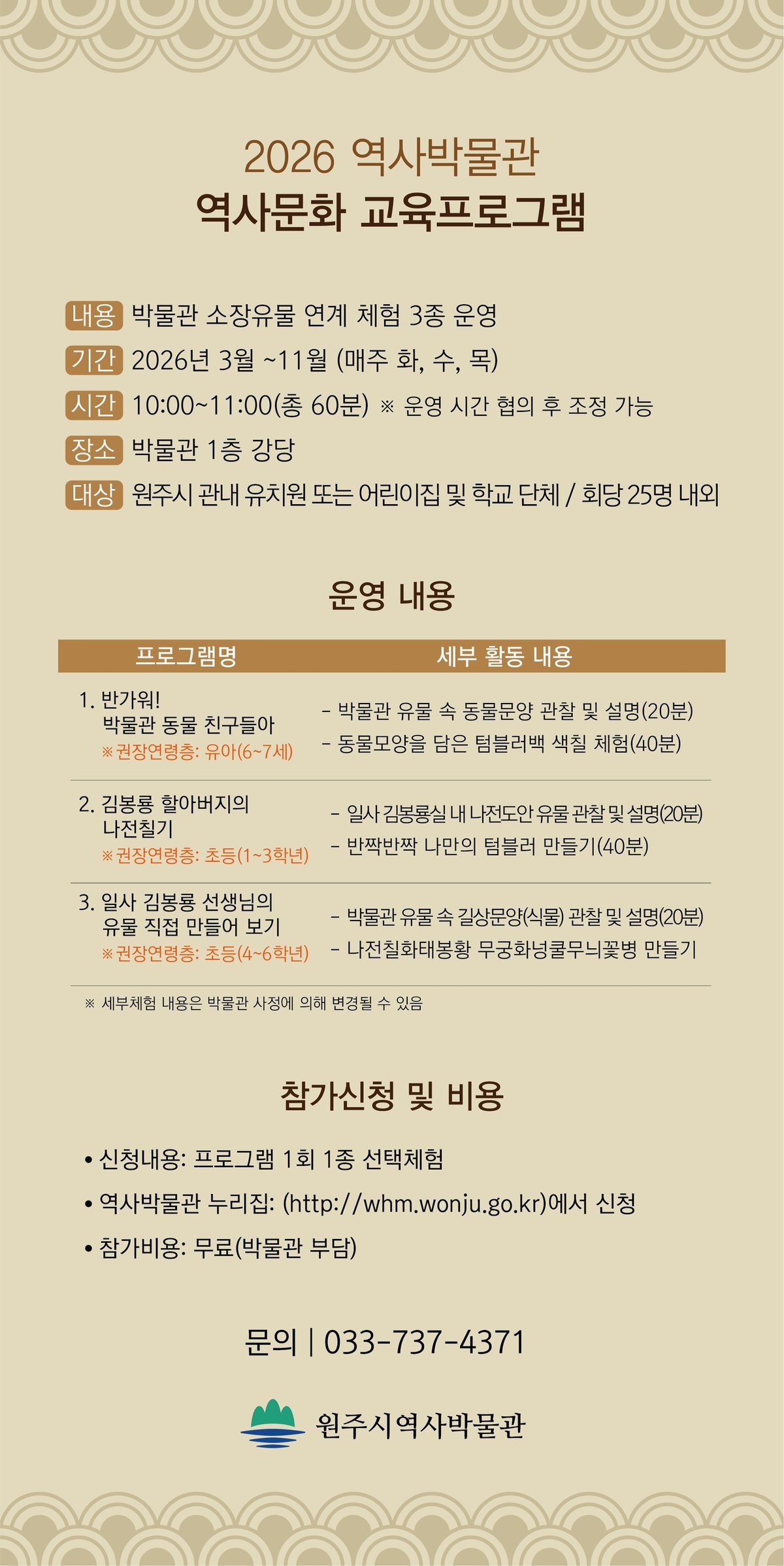 [아시아월드뉴스] 원주시역사박물관은 오는 3월부터 11월까지 ‘2026년 역사문화 교육프로그램’을 운영한다.