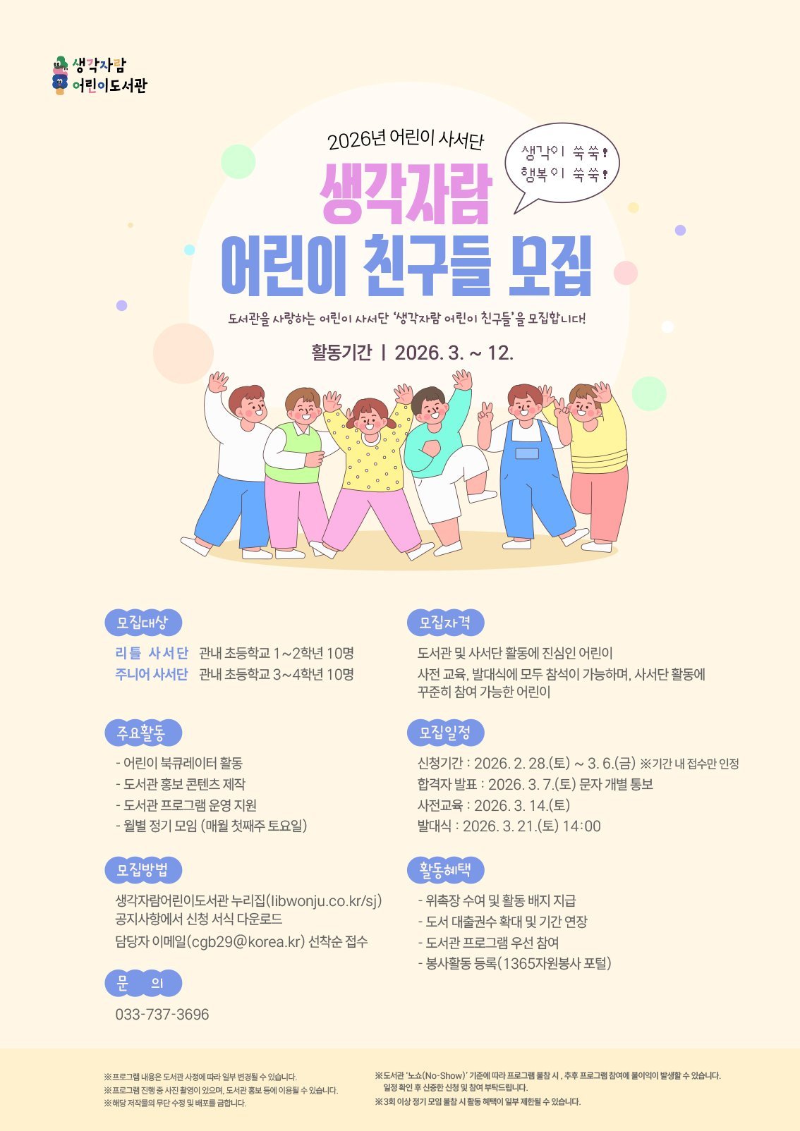 자세한 사항은 생각자람어린이도서관으로 문의하면 된다.