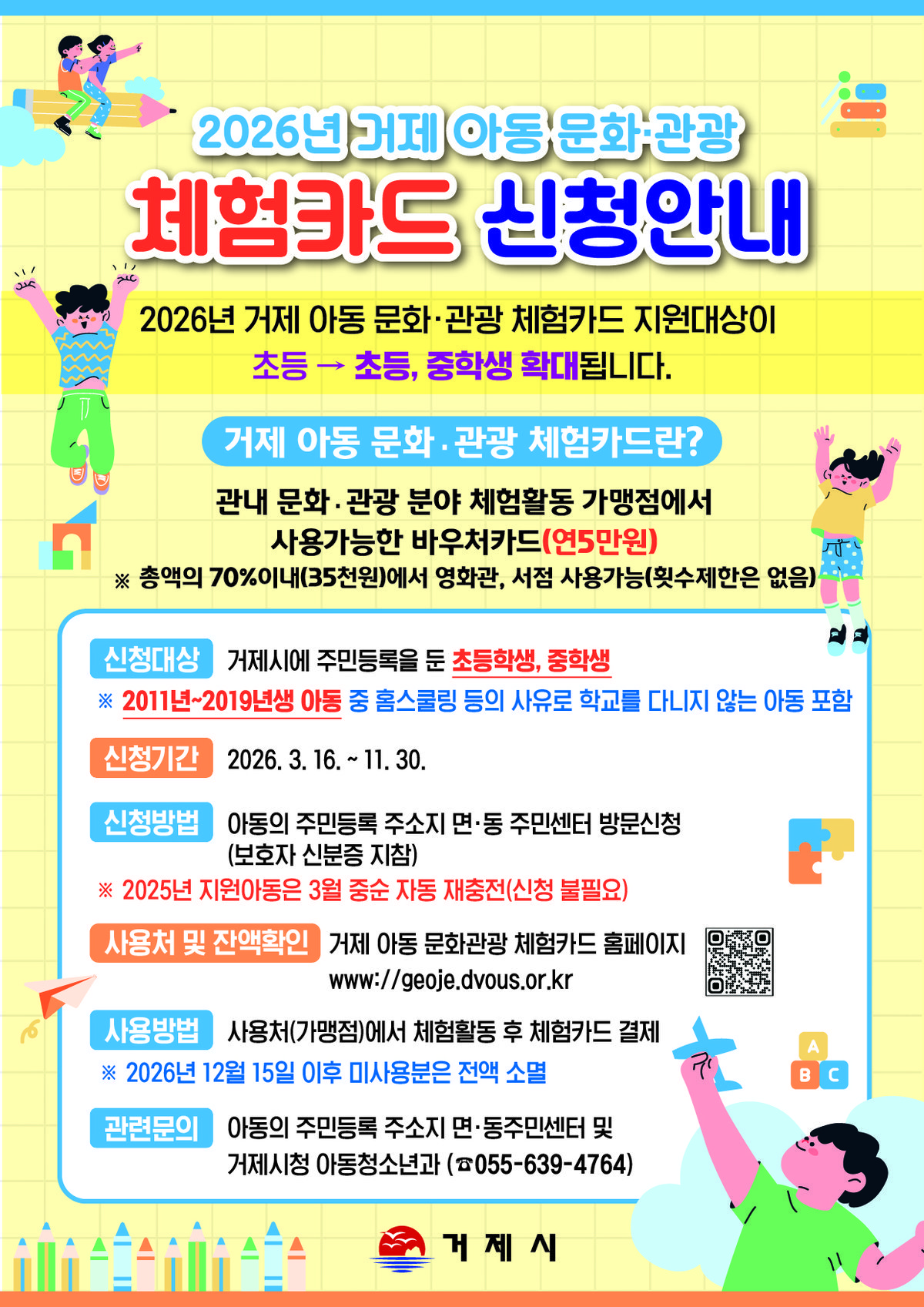 이에 따라 2026년부터 거제 아동 문화·관광 체험카드 지원 대상이 기존 초등학생에서 초·중학생까지 확대되며 이를 통해 다양한 연령대 아동에게 폭넓은 체험 기회를 제공하고 건강한 성장 환경을 조성할 것으로 기대된다.