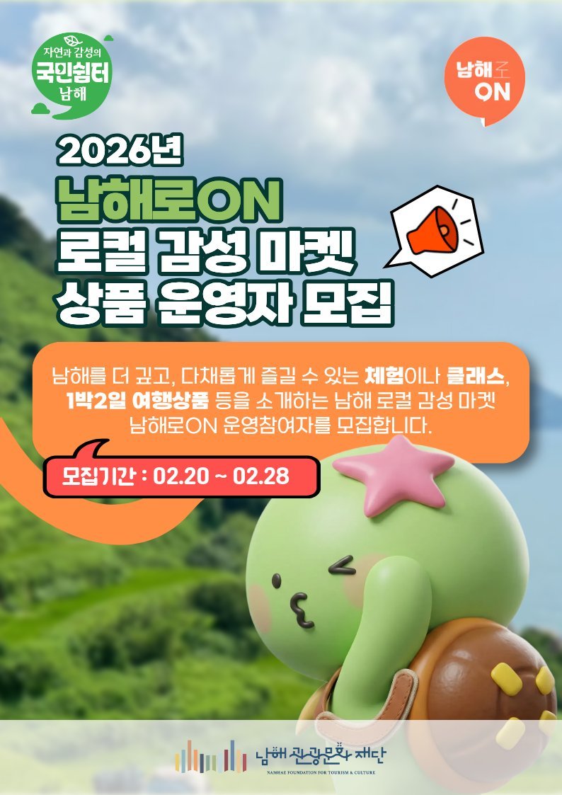 한편 ‘남해로ON 로컬 감성 마켓 상품 운영자 모집’과 관련한 문의 사항이 있을 재단 관광마케팅팀으로 연락하면 된다.