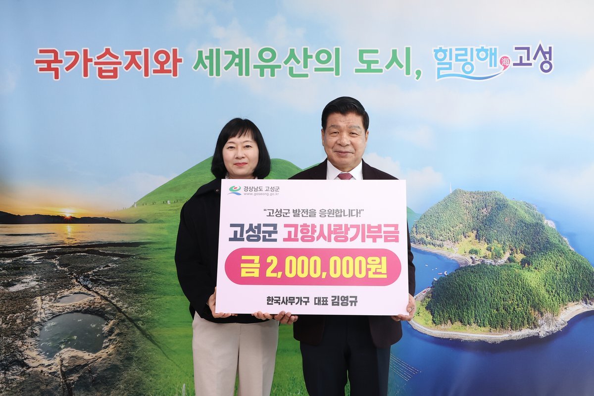 김영규 대표는 “한국사무가구가 터를 잡고 성장해 온 고성의 발전에 보탬이 되고자 작은 정성이지만 기부에 동참하게 됐다”며 많은 분들이 나눔에 함께해 더 따뜻하고 풍요로운 사회가 되길 바란다“고 소감을 전했다. 이에 김종춘 인구청년추진단장은 “김 대표님의 지속적인 나눔 실천과 고성에 대한 깊은 애정에 감사드린다”며 “기탁해주신 소중한 기부금은 군민의 삶의 질 향상과 지역 발전을 위해 의미 있게 사용하겠다”고 밝혔다.