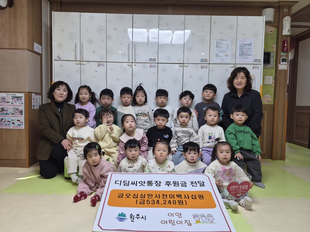 [아시아월드뉴스] 이안어린이집은 지난 23일 원아들과 함께 자립 아동 지원을 위한 디딤씨앗통장 후원금 53만 4240원을 원주시에 전달했다.