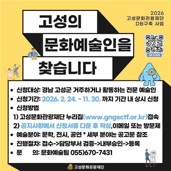 [아시아월드뉴스] 고성문화관광재단은 지역 예술인 정보의 통합적·체계적 관리 기반을 마련하고 문화예술 지원사업의 효율적 운영을 도모하기 위해 ‘2026 지역 예술인 DB 등록·구축 사업’을 추진한다.