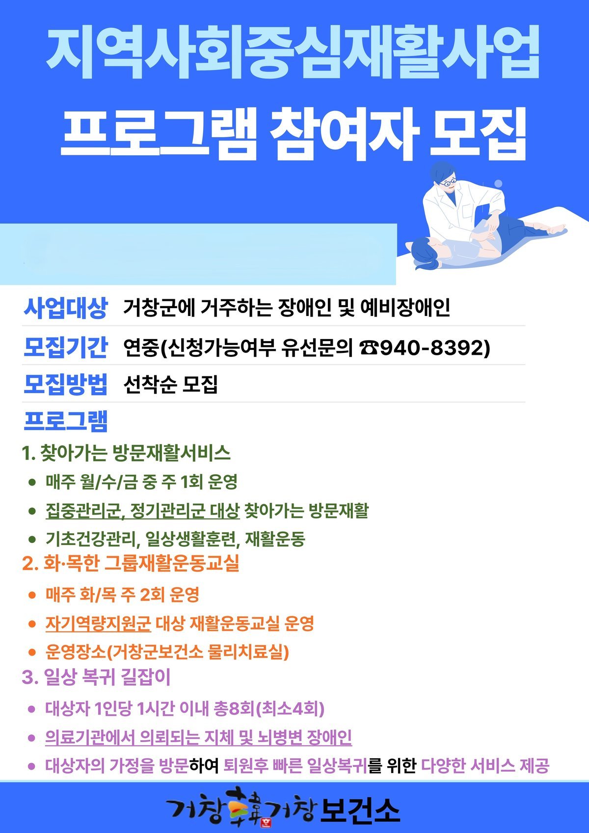 참여 대상은 거창군에 거주하는 법정 등록 장애인 및 및 예비 장애인과 재활이 필요한 만65세 이상 어르신이다.