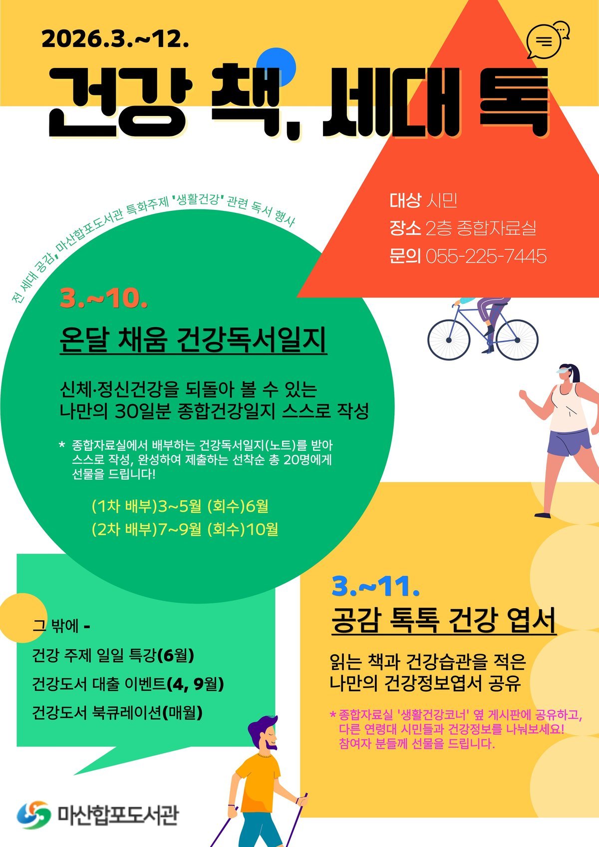 [아시아월드뉴스] 창원특례시 마산합포도서관에서 3월 3일부터 마산합포도서관의 특화분야 주제인 '생활건강'관련 독서문화 프로그램, '건강 책, 세대 톡'을 운영한다.