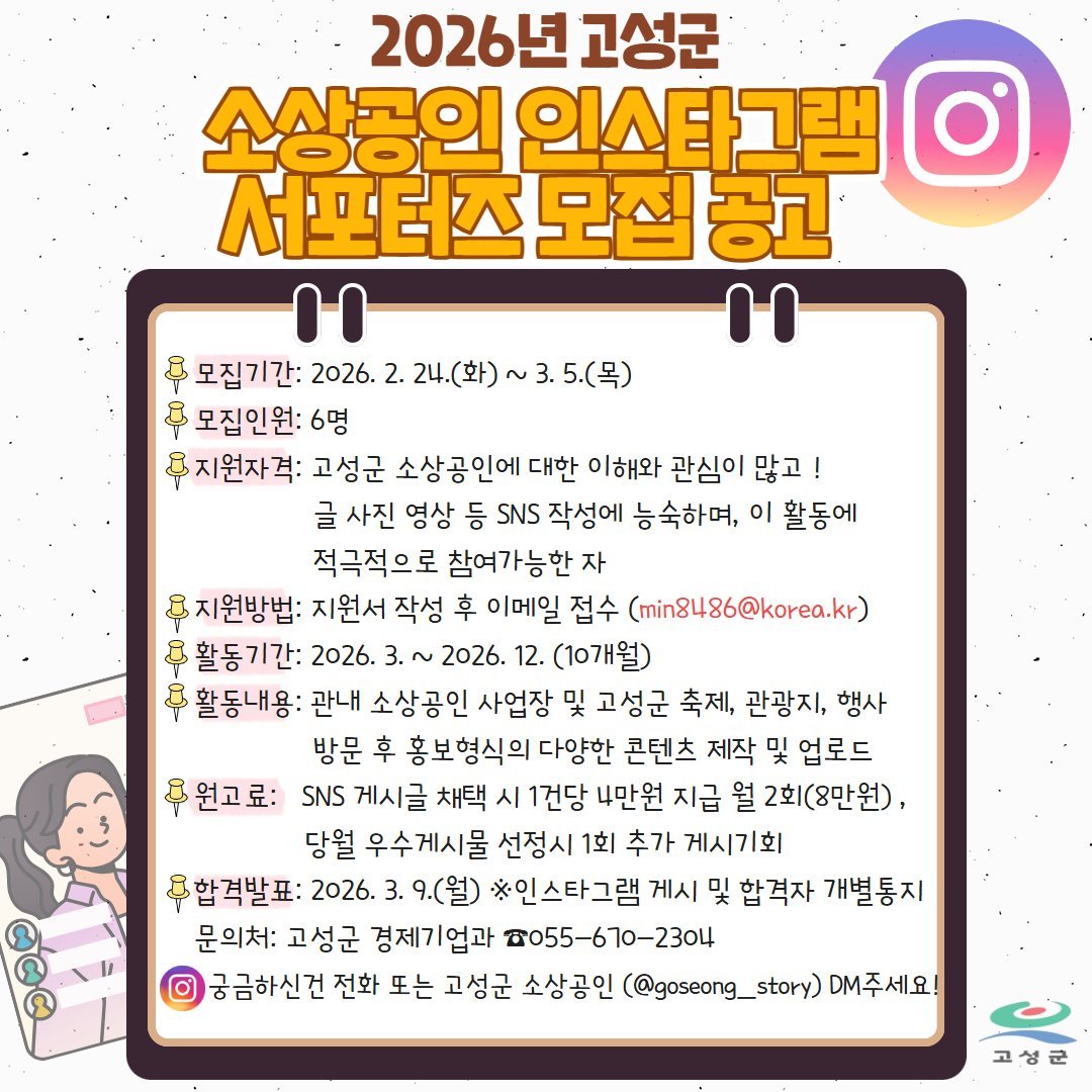 [아시아월드뉴스] 고성군은 고성의 맛과 멋을 알릴 맛집, 소상공인 사업장 및 각종 소상공인 지원시책 등을 소개할 공식 인스타그램 홍보 서포터즈를 모집한다.