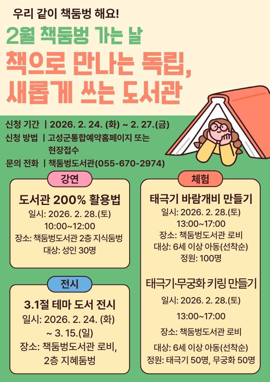 [아시아월드뉴스] 고성군 책둠벙도서관이 매월 마지막 토요일 운영하는 대표 브랜드 프로그램 ‘책둠벙 가는 날’을 맞아, 오는 28일 제107주년 삼일절의 의미를 되새기는 풍성한 프로그램을 선보인다.