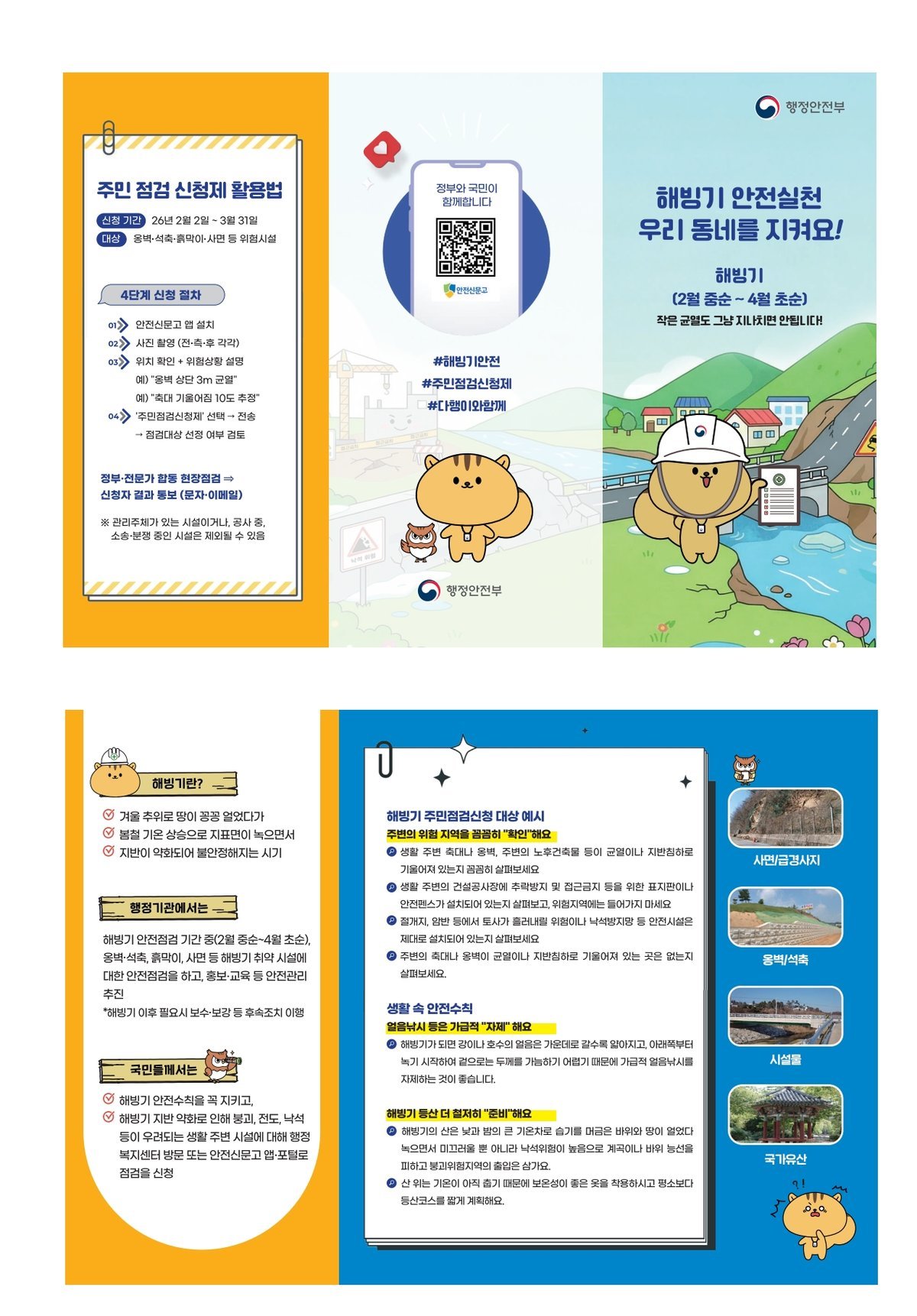 해빙기 주민점검신청제는 이와 같은 해빙기 안전사고를 사전에 방지하기 위해 주민이 직접 위험이 우려되는 시설을 신청하고 군에서 점검대상 선정 여부 검토 후 군과 민간 전문가가 합동으로 현장 방문해 점검하는 제도이다.