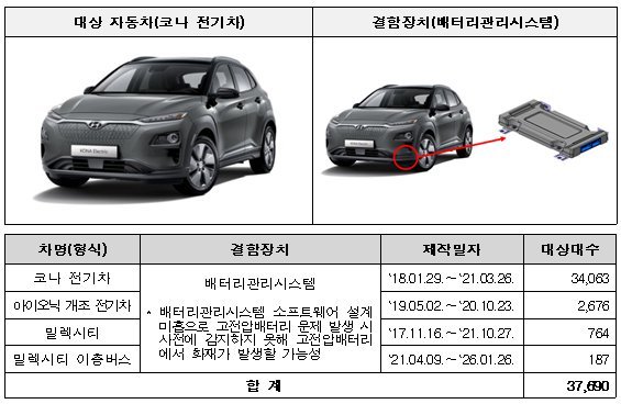 ① 코나 전기차 등 4개 차종 37,690대는 배터리관리시스템 소프트웨어 설계 미흡으로 고전압배터리 문제 발생 시 사전에 감지하지 못해 고전압배터리에서 화재가 발생할 가능성으로 2월 27일부터 시정조치에 들어간다.