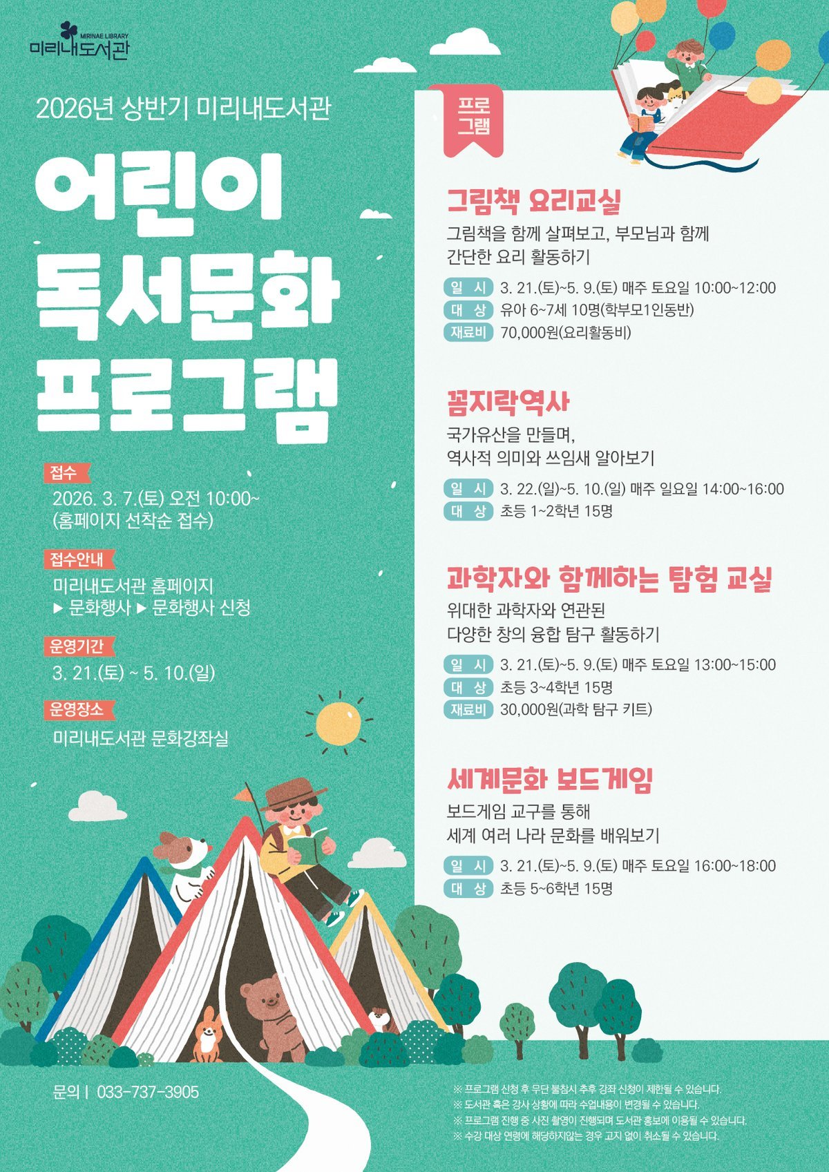 이번 프로그램은 △다양한 관점에서 그림책을 살펴보고 부모님과 함께 간단한 요리를 만드는 ‘그림책 요리교실’△역사 속 국가유산을 직접 만들며 관심을 키우는 ‘꼼지락역사’△위대한 과학자와 연관된 창의·융합 탐구 활동을 진행하는 ‘ 과학자와 함께하는 탐험 교실’△보드게임을 통해 세계 여러 나라 문화를 주제로 소통하는 ‘세계문화 보드게임’등 총 4개 강좌로 구성됐다.