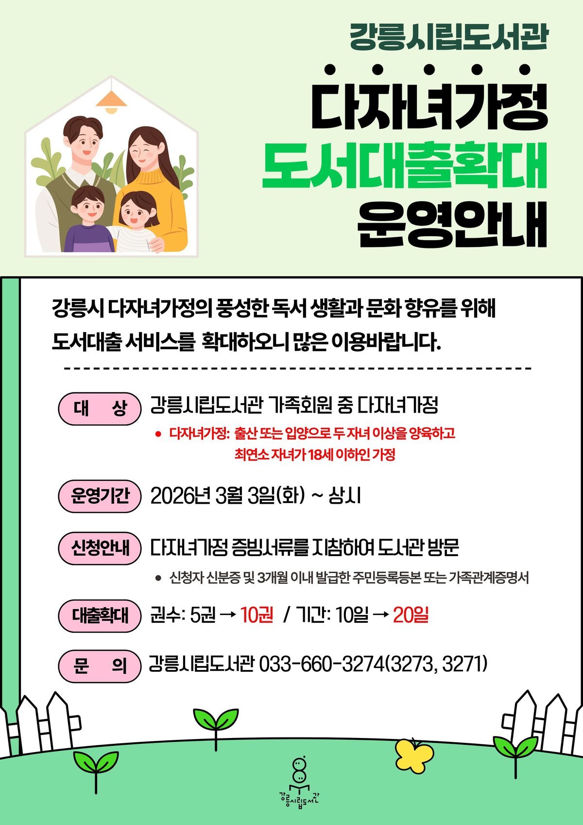 김남림 강릉시립도서관장은 “강릉시 다자녀가정의 풍성한 독서 생활과 문화 향유를 지원하고 가족 중심의 독서 문화 확산에 도움이 되길 바란다”며 “앞으로도 시민 맞춤형 도서관 서비스를 지속적으로 확대해 나가겠다”고 밝혔다.