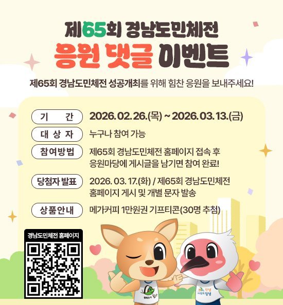 2월 26일부터 3월 13일까지 2주간 누리집 내 응원 게시판에 대회 성공 기원 메시지를 남기면, 추첨을 통해 30명에게 소정의 상품을 지급할 예정이다.