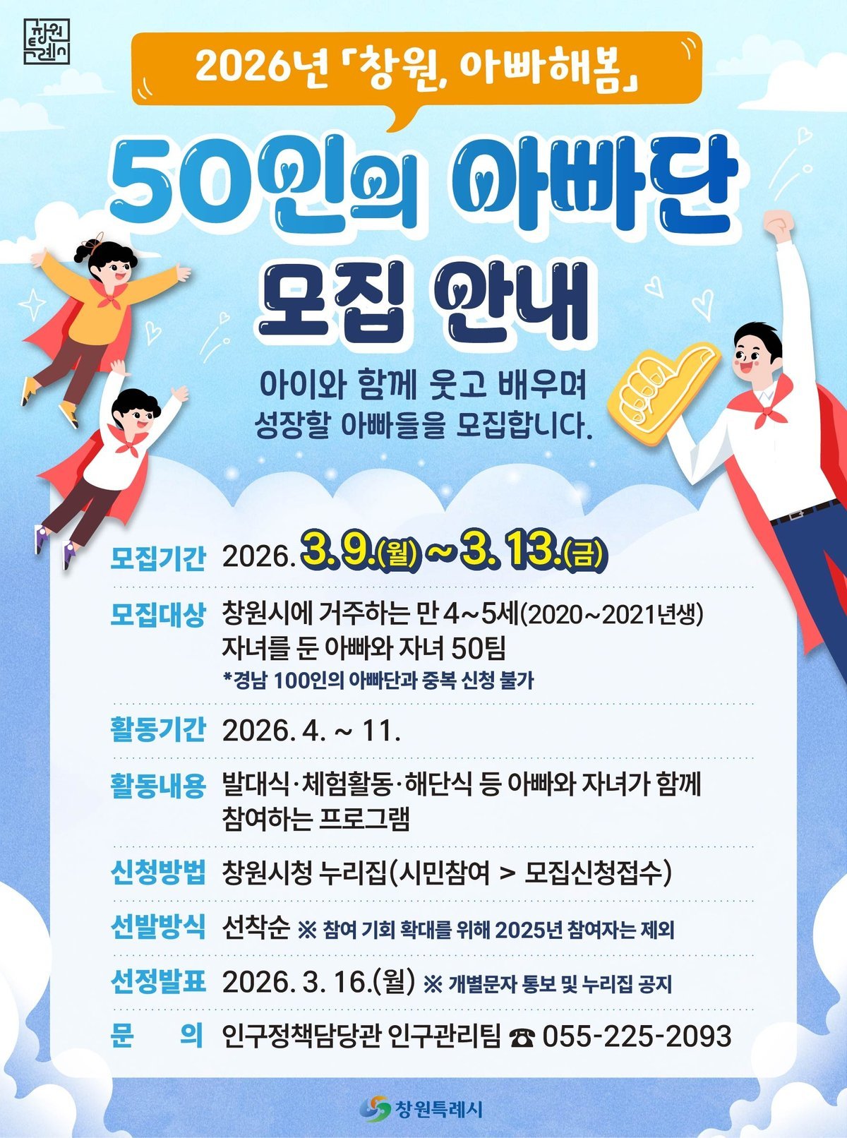 [아시아월드뉴스] 창원특례시는 아빠의 육아 참여를 확대하고 가족 친화적 사회 분위기를 조성하기 위해 오는 3월 9일부터 13일까지 '2026년 창원, 아빠해봄'사업에 참여할 아빠단 50명을 모집한다고 밝혔다.
